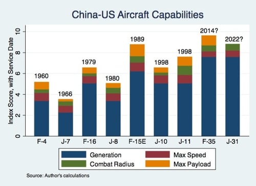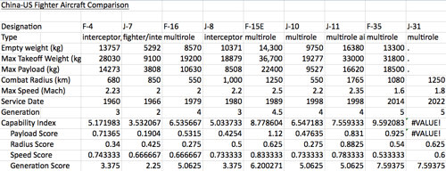 I'm working on a project where I want to compare military hardware between the US and China. I've thought of a couple of options, including the tonnage and Verticle Launch System capabilities of ships, as well as the range and payload of ballistic missiles. But what I'd really like to do is trace the evolution of each country's relative aircraft performance over time.