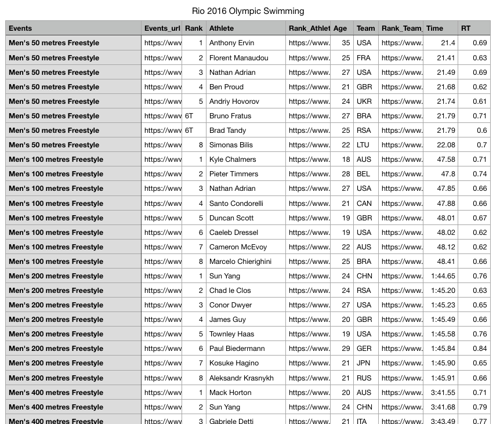The subject to my experiment was Sports Reference.com's excellent (though presumably soon-to-be-extinct) Olympics database. I wanted to take a look at the fatigue and average pace curves for swimming at the Rio Olympics (a post on this will follow...), and this tool was the excuse I needed to dig into the data.