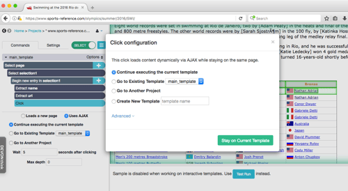 This command is straightforward: whatever hyperlink you select, the program will click on it after its finished with the current page. The main concern is how you want it to treat the new page of data. Your choices are either to have it scrape the new page according to your current set of rules (or 'template'), or to create a new set of rules for the fresh page ('create a new template'). If the latter is chosen, you simply build scrape instructions in the same way as described above.