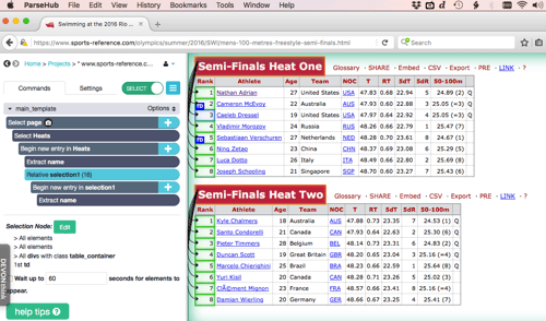 As you click on the desired elements, the program will highlight in yellow its suggestions for similar elements. ParseHub's ability to learn connected elements is strong: click the first few names in a column and it will quickly select everything else all he way down to the bottom.