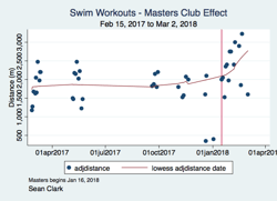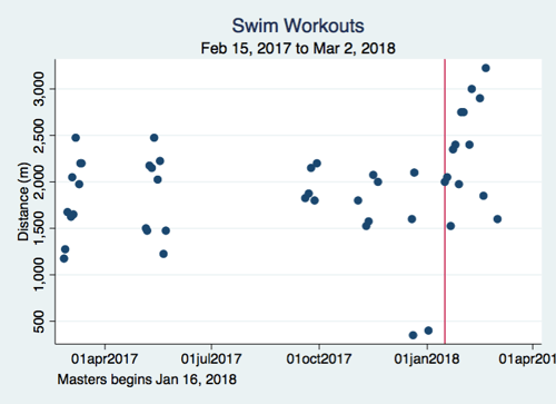 The second story is the difference that swimming with a club can make. The red line below marks when the local Masters club started up, and you can see how the mileage rockets accordingly.
