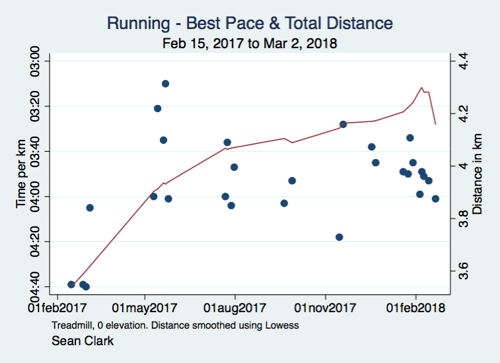 If I smooth out the mileage trend (using Lowess here) there is some overall distance improvement, at least until I hit a cold in late February. But it's come at the cost of a pace that's nothing to brag about.