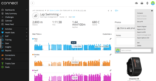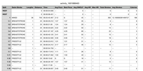 One thing the Vivo doesn't capture is (in-water) heart rate. For this you need an extra monitoring band. I planned to pick one up (and still do, to better target pace times to heart rate zones), but I was a little uncertain about compatibility and just never got around to it. Plus, as we'll see below, Garmin has not designed its split-level data very well. I'd like that to be a bit smoother before I worry about more gear.