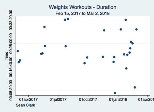 I do a pretty regular set of exercises, and the more time spent in the gym means more of them get done. So the inference here is that the longer the duration, the longer and harder I've worked.