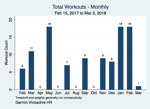 The reason for the 0-count months was travel and some paternity leave, but I think it's fair to say that once you miss a workout, it's frighteningly easy to miss a second...and a third as well.