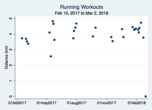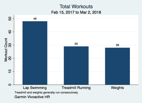 Having downloaded the aggregate data, which runs from February 15, 2017 (when the Vivo arrived, about two weeks after I got back into the water) to March 2, 2018 (an arbitrary, 12-month cut-off), I ran it through Stata to clean it up a bit and produce the following charts.