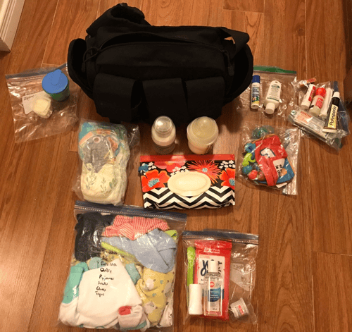 - Ziplock for diaper kit (wet wipes, hand sanitizer, zincofax, and poop bags)